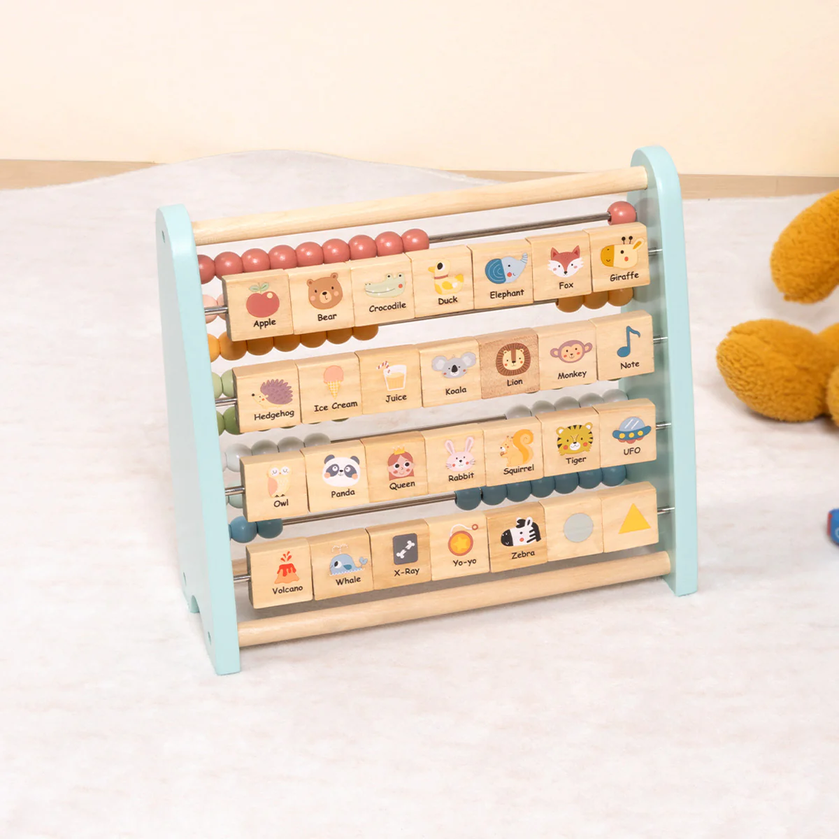 Con este producto los niños pueden explorar el encanto atemporal de un ábaco de cuentas clásico, perfecto para perfeccionar las habilidades de conteo y los conceptos matemáticos. Mientras tanto, en el reverso, les espera una deliciosa sorpresa: un ábaco alfabético único con letras mayúsculas y minúsculas adornadas en los bloques. La parte posterior de cada bloque muestra una imagen ilustrativa correspondiente al alfabeto respectivo, transformando el aprendizaje en una experiencia lúdica e inmersiva. Este versátil juguete combina a la perfección diversión y educación, animando a los niños no solo a dominar el alfabeto, sino también a explorar los colores y desarrollar habilidades esenciales de conteo, todo ello en el encantador entorno de un bosque. Edad recomendada 24 meses en adelante